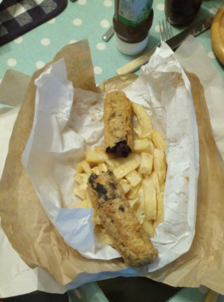 Dinner was, I am delighted to say, fish suppers (though mine was technically a black pudding supper). Then came a little strategic repacking for the next portion of the trip: we’ll be back at my folks’ place for Chapter 4, so there’s no need to take all the gifts for back home with us. This reduces our suitcase count by 50%, which will be nice for the B&B.